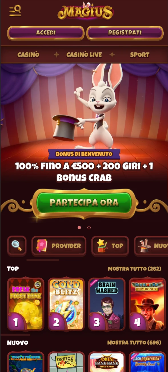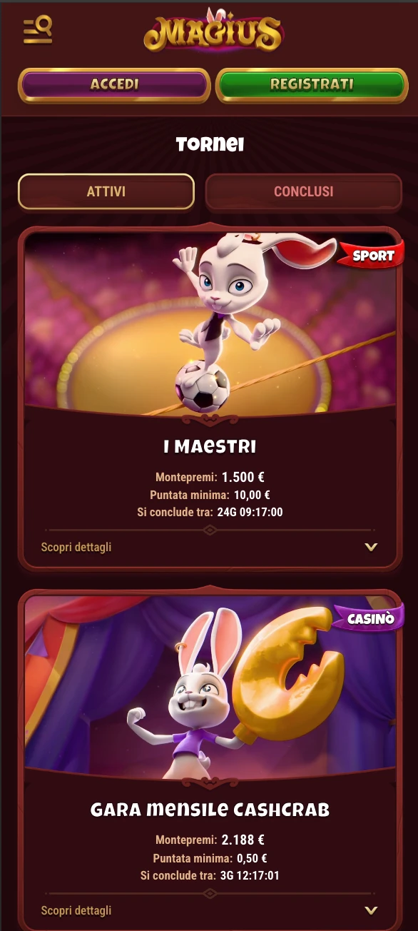 Per i principianti, risulta particolarmente rilevante il bonus di benvenuto, che include un bonus Crab, 200 giri gratuiti e fondi extra per il gioco. Per quanto riguarda il bonus senza deposito del Magius casino, non è previsto né per i principianti né per gli utenti abituali. Al momento, tale bonus nel Magius casino non è presente nel programma del casinò.