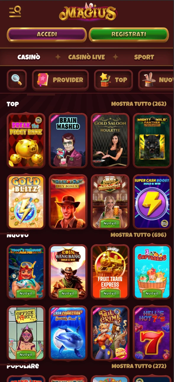 Un’ampia collezione di giochi consente di trascorrere piacevolmente il tempo su Magius casino. Il sito propone titoli sviluppati da fornitori rinomati, come Octoplay, Novomatic, ELK e molti altri. In totale, sono disponibili oltre 9.000 giochi provenienti da più di 110 sviluppatori di software di gioco. Tra i principali giochi disponibili su Magius casino, si possono distinguere diverse categorie popolari: