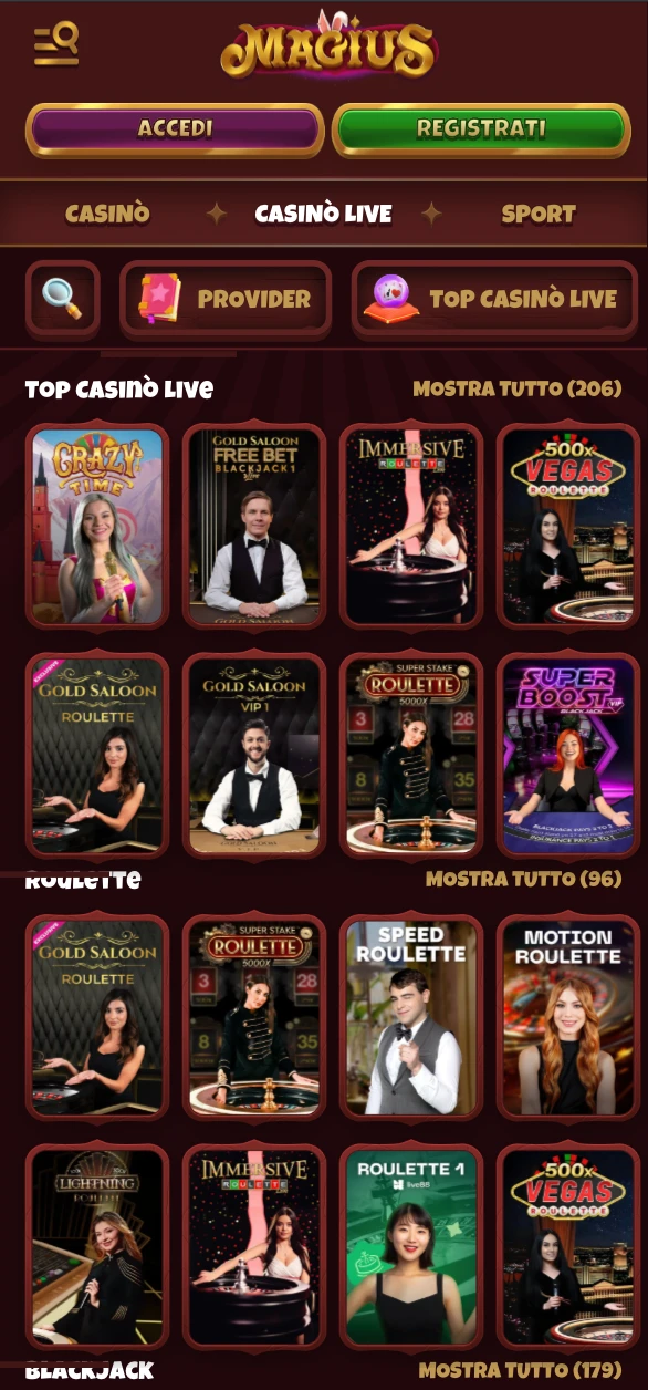 Una categoria dedicata all’intrattenimento dal vivo è disponibile nel menu, subito dopo la sezione principale del casinò. Qui è possibile accedere ai più svariati giochi con live dealer del Magius casino, forniti da provider di alto livello come Evolution, Ezugi, Pragmatic Live e altri. La sezione include giochi a premi, roulette, blackjack, baccarat, poker e molte altre varianti, con limiti di puntata diversificati, compresi quelli minimi.