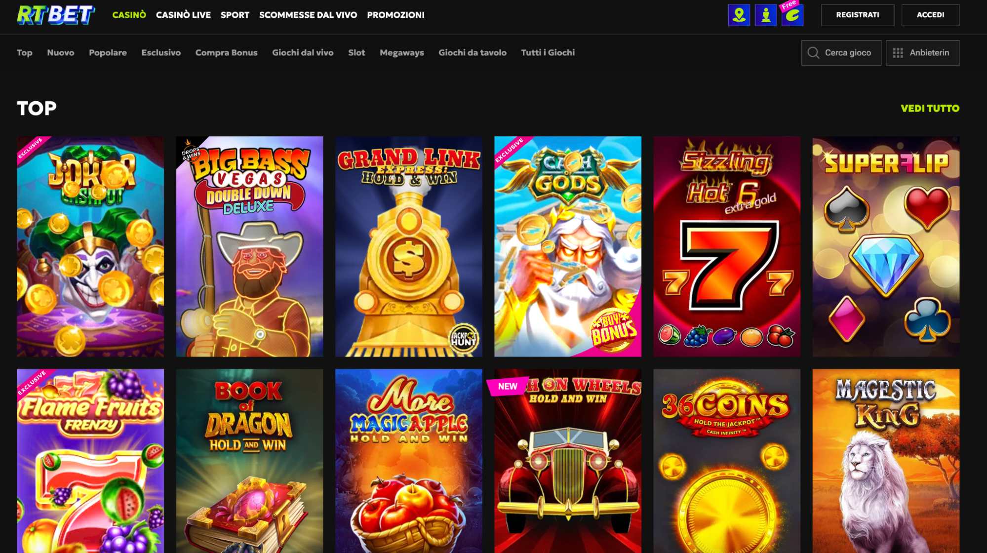 Il catalogo giochi rappresenta senza dubbio il fiore all’occhiello di RTBet. Con oltre 10000 titoli, la piattaforma offre una varietà di scelta che pochi casinò online possono eguagliare. La libreria è alimentata da più di 100 provider di software, tra cui giganti del settore come NetEnt, Play’n GO, Pragmatic Play, Microgaming ed Evolution Gaming.