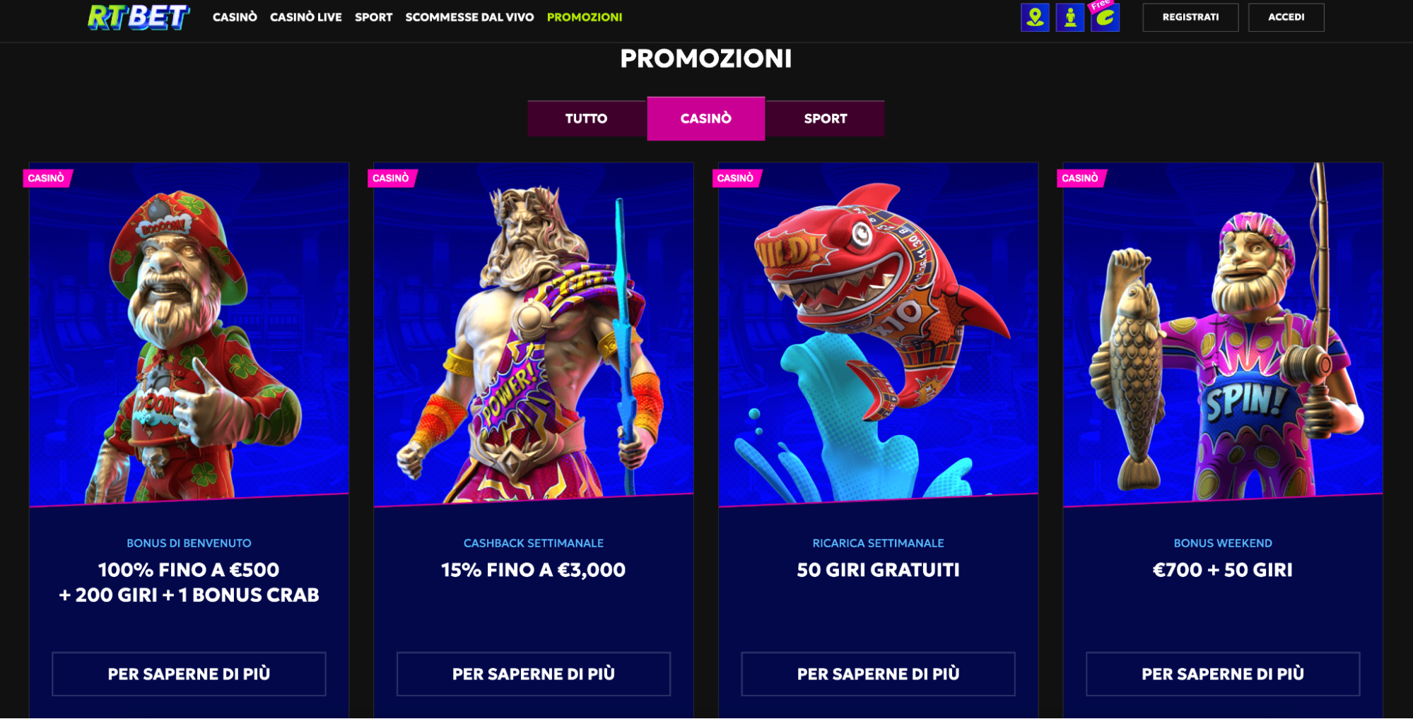 RTBet accoglie i nuovi utenti con un bonus di benvenuto RTBet molto vantaggioso, pensato per offrire un valore aggiunto sin dal primo deposito. Inoltre, propone una vasta gamma di promozioni settimanali che soddisfano sia gli appassionati di casinò che di scommesse sportive.