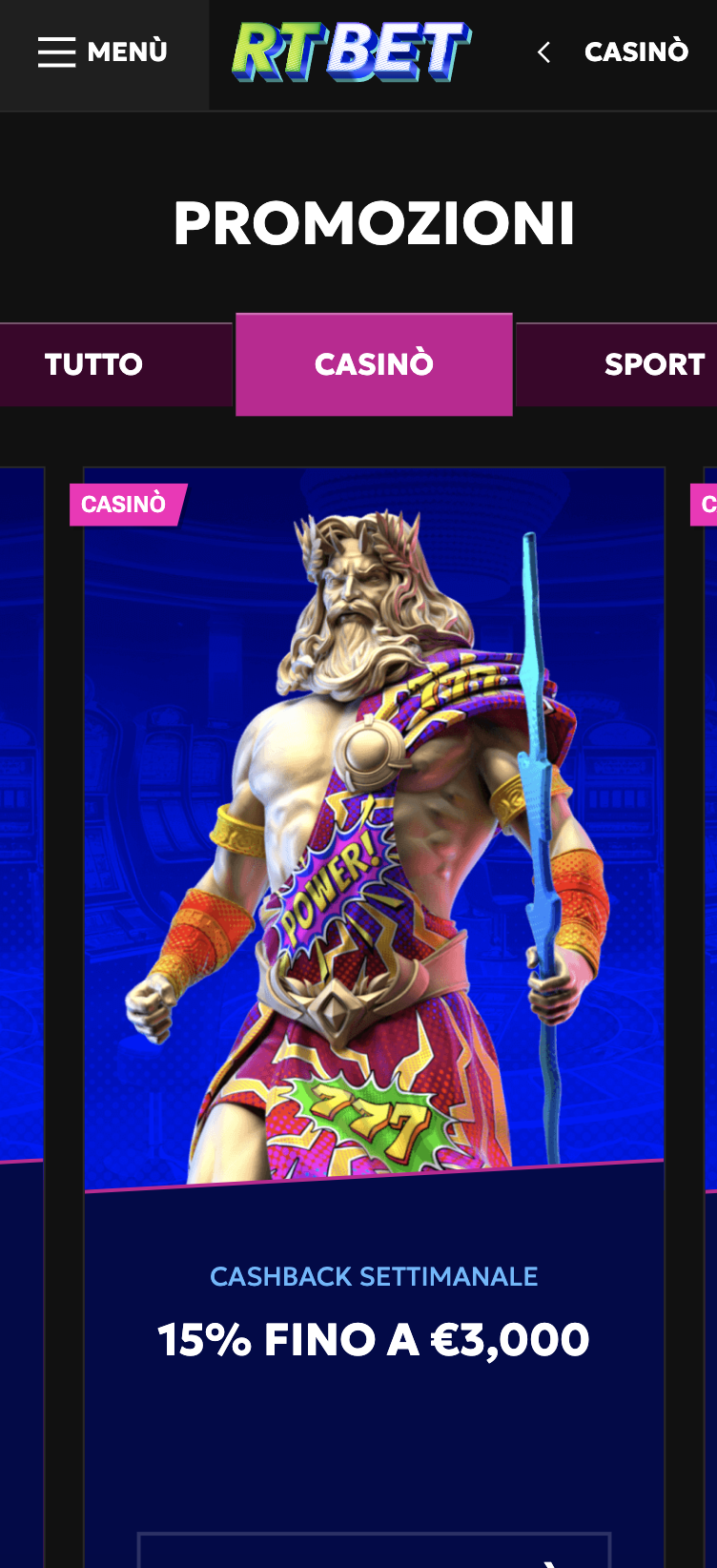 Oltre al cashback VIP, RTBet offre un Cashback Live del 25% fino a 200€ e un Cashback Settimanale sulle slot del 15% fino a 3.000€, disponibile per i giocatori dei primi 3 livelli VIP.