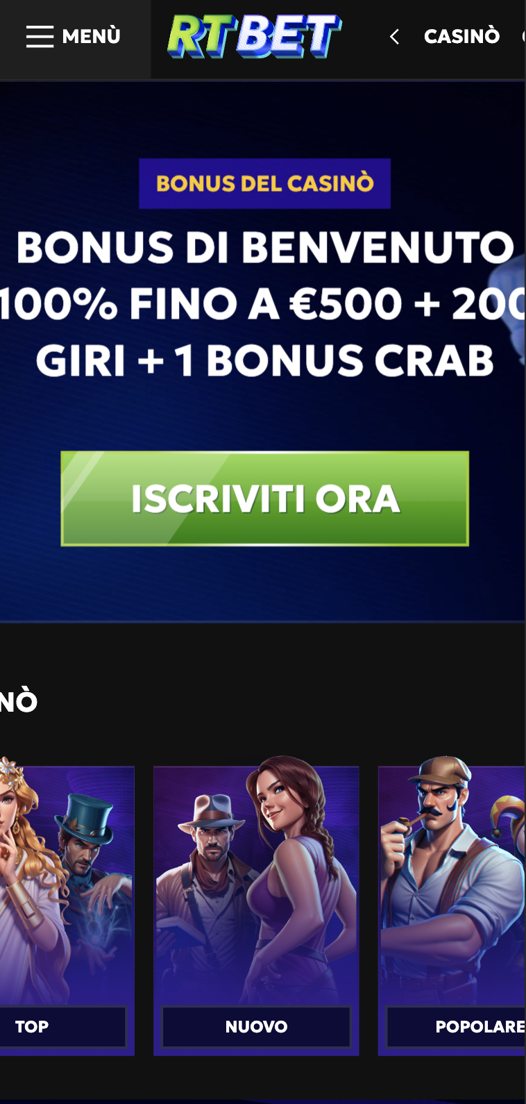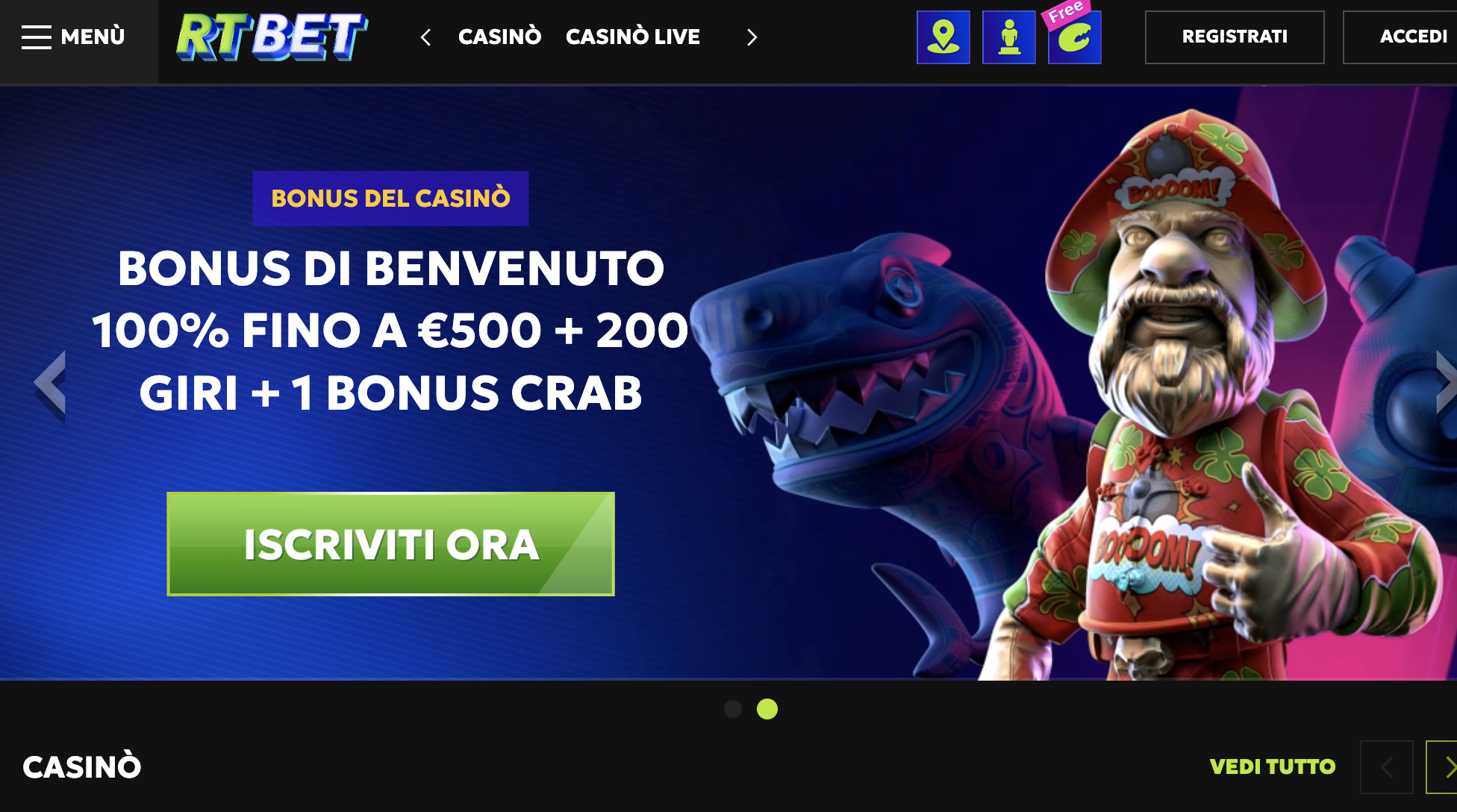 RTBet propone un bonus del 100% fino a 500€ sul primo deposito, con l’aggiunta di 200 giri gratuiti e un Bonus Crab. È un’ottima offerta per iniziare a esplorare il vasto catalogo di giochi del casinò, anche se non rientra tra i bonus senza deposito Italia.