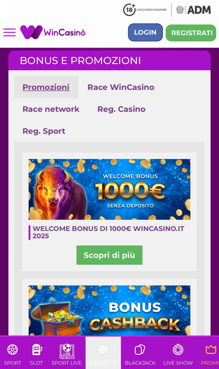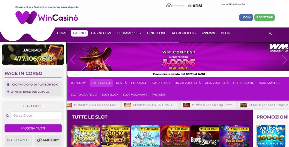 WinCasino è una piattaforma di gioco online che offre una vasta gamma di opzioni per gli appassionati di slot machine, giochi da tavolo live e molto altro. Con oltre 1.500 giochi disponibili, questo casinò si rivolge sia ai nuovi giocatori grazie ai generosi bonus di benvenuto sia ai veterani che cercano varietà e qualità. Proprietà della società italiana Vincitu Srl, WinCasino è dotato di una regolare licenza AAMS (ADM), che ne garantisce la legalità e l’affidabilità.