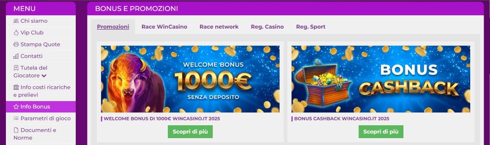 Su Wincasino troverai un’ampia gamma di bonus e di promozioni ideali per attirare nuovi giocatori e non solo. Dal bonus di benvenuto ai cashback settimanali, le opportunità per incrementare il tuo saldo e vincere alla grande sono numerose, anche se alcune restrizioni potrebbero sembrare restrittive.